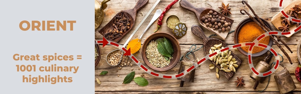 Spice dreams from 1000 and one nights: The Orient promises a variety of flavours from colourful spices - cardamom, cumin, saffron and cinnamon. Indian Spices are fiery piquant or offer a mild sweetness.